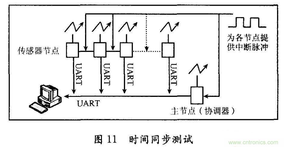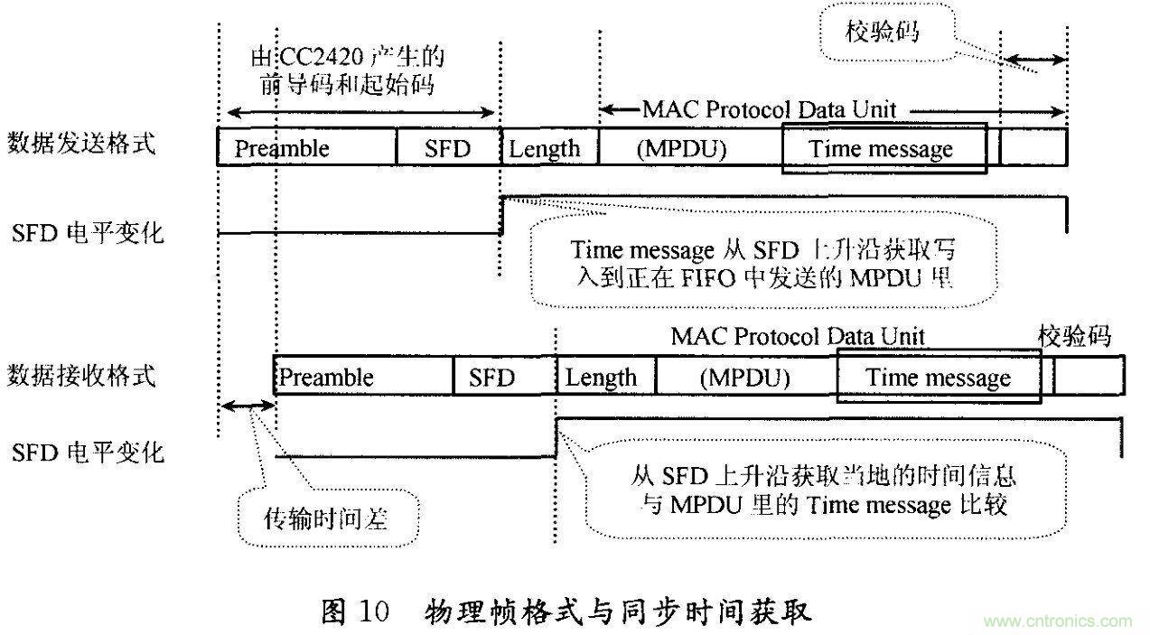 時間同步協議軟件的測試連接圖如圖11所示。主控節點和傳感器節點被連接到一 個公共的有線信號上,這個信號又連接到MSP430的帶計時器捕獲周期性地發送一個包含時間信息的信標幀給從節點來維持網絡同步通信。在協議軟件實現時, 需要對FTSP進行簡化,采用ZigBee星型網絡拓撲結構對時間同步所需的計算資源進行最小化處理。Zig-Bee消息的時間固定點選擇為幀起始限定符 (SFD)。參考圖3中的CC2420射頻收發器與微控製器接口對應管腳的高低電平,圖1O顯示了IEEE802.15.4物理幀格式l和時間信息獲取過 程。主節點無線收發器發送一個信號給控製器,指示SFD字節已被接收或發送。一旦SFD字節被發送,無線收發器驅動SFD管腳,向微處理器提出中斷要求, 並啟動時間捕獲。這樣,微處理器在SFD字節被發送後可立即獲得一個時間點,並將該時間插入到當前的時間同步消息中去。同樣,當接收器接收到SFD,也隨 jichanshengyigebendishijianxinxi,bingbataheshijiantongbuxiaoxiyiqicunchu。weikongzhiqitongguobijiaolianggeshijianxinxi,keyiquedingbendishijianhequanwangshijiandepianyiliang,bingtiaozhengbendishizhongyuzhujiedian (協調器)全局時鍾保持一致。