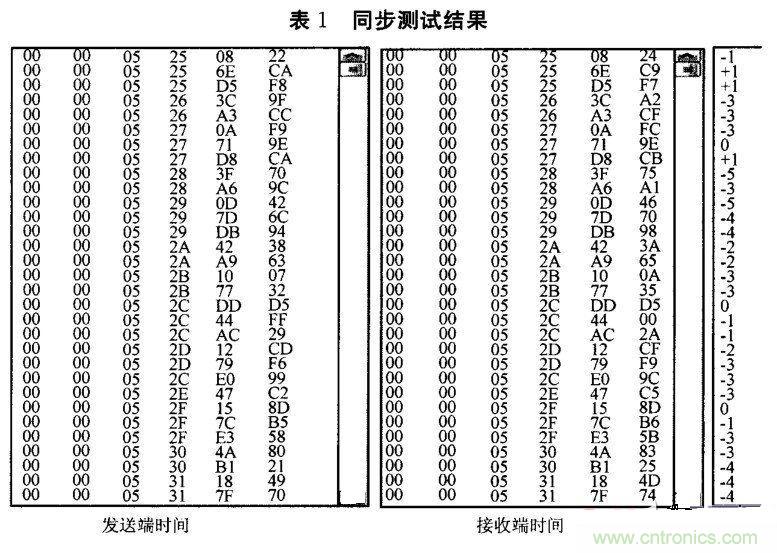 表 1給出了十六進製數據表示的時間同步測試結果。表中,左邊三個兩位十六進製數分別表示小時、分鍾和秒,接著兩個兩位十六進製數表示毫秒,最右邊的兩位十六 進製數以10微秒為單位。從表中可以看出:當同步校正間隔約為1s時,以約100mS的頻度中斷一次進行同步測試,其最大時間同步誤差為50us。顯然, 時間同步精度滿足設計要求。在時間同步測試過程中還發現:提高同步消息發送的頻率,網絡節點時間與全網時間可維持更好的同步。