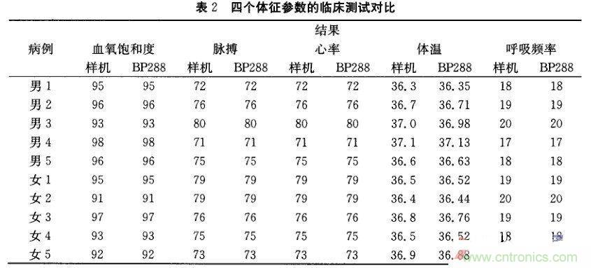本 可穿戴生命體征監護設備樣機已研製完成。采用本樣機對高壓氧艙中的10例病例(男5例,女5例,年齡22~71歲,平均年齡46.2歲)在2.0ATA艙 壓下進行臨床測試(終端機與主機距離為10米),並與日本COLINBP288監護儀檢測結果進行對照。表2顯示的血氧飽和度、脈搏、心率、體溫、呼吸頻 率等參數的對比檢測數據的一致很好。