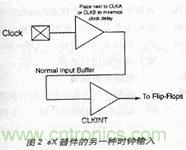 采用這種輸入電路後,由於常規I/O是三態的,因此用戶不必擔心時鍾進入器件。當然,增加一級門電路會產生0.6ns的較大時鍾延時,幸好這在多數低功率設計中是可以接受的。注意應將與CLKINT緩衝器相關的CLKA或CLKB引腳接地。
