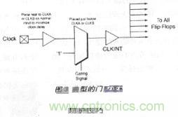 這 是(shi)最(zui)廣(guang)泛(fan)使(shi)用(yong)的(de)方(fang)法(fa),即(ji)在(zai)器(qi)件(jian)末(mo)使(shi)用(yong)時(shi)截(jie)斷(duan)時(shi)鍾(zhong)來(lai)降(jiang)低(di)功(gong)耗(hao)。然(ran)而(er)正(zheng)確(que)地(di)截(jie)斷(duan)時(shi)鍾(zhong)十(shi)分(fen)重(zhong)要(yao)。門(men)控(kong)信(xin)號(hao)與(yu)門(men)控(kong)邏(luo)輯(ji)應(ying)正(zheng)確(que)地(di)設(she)計(ji),以(yi)消(xiao)除(chu)時(shi)鍾(zhong)線(xian)上(shang)的(de)任(ren)何(he)毛(mao)刺(ci)。再(zai) 者zhe,門men控kong邏luo輯ji會hui增zeng加jia時shi鍾zhong的de延yan時shi,影ying響xiang建jian立li時shi間jian與yu保bao持chi時shi間jian。由you於yu抗kang熔rong斷duan是shi一yi種zhong極ji快kuai速su的de技ji術shu,引yin入ru的de延yan時shi很hen小xiao且qie容rong易yi控kong製zhi。在zai使shi用yong時shi鍾zhong門men控kong時shi,用yong戶hu應ying仔zai細xi地di安an置zhi 門控邏輯,將時鍾網絡的延時降低到最小限度。典型的門控邏輯如圖3所示。