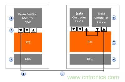 示例係統的物理路徑請見圖1和圖2。製動位監控器模塊與控製器 ECU 相連,轉而又連接到執行器上。在每個模塊內部,各個軟件組件也對延遲造成影響。我們將著眼於這些組件對整體係統延遲的影響。