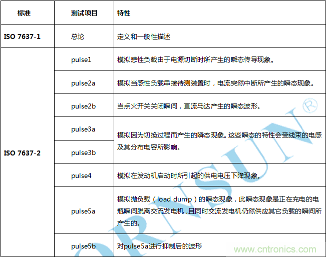 針對汽車電子自身產生的幹擾,國際無線電幹擾委員會(CISPR)對汽車電子業提出了嚴格的要求,尤其是車載收音機、數字電視、導航設備都是這種幹擾的重災區。所以 CISPR25:用於保護車載接收機的無線電騷擾特性的限值和測試方法,對汽車電子自身的發射狀態也有了明確的等級判定。EMS方麵的測試項目如下所示: