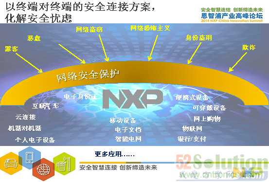 從以上圖中可以看到NXP保障網絡安全的方案,從工業控製,智能電網,醫療設備和雲服務方麵。另外,NXP也提供以終端對終端的安全連接方案在互聯汽車、物聯網和便攜的可穿戴式應用。