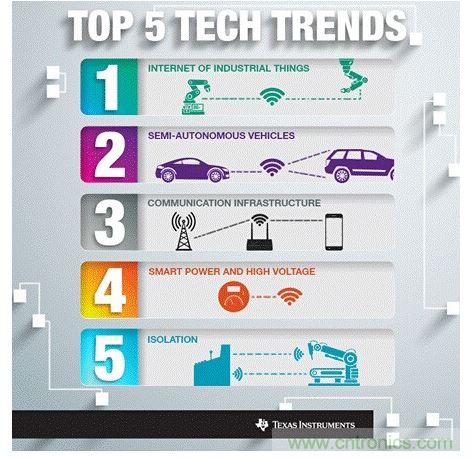 在迎接2015到來之際,我們有必要花時間來評估和預測未來的一年中將會出現的技術挑戰和突破創新。通過與眾多戰略客戶、大學合作夥伴以及TI產品線的技術專家進行探討後,我們認為TI將在一些重要技術趨勢中發揮戰略性作用。這些技術趨勢正推動著汽車和工業等多個市場的發展,而在此過程中,TI的工程師將幫助應對半導體技術領域的獨特挑戰,並利用先進技術改善我們的生活。