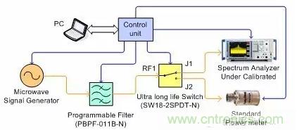 在圖1中,微波信號發生器所產生的信號經過一個可編程的帶通濾波器到達一個SPDT微波開關的輸入端(RF1),開關的二個輸出端J1和J2fenbiejiexuyaobeixiaozhundepinpufenxiyihebiaozhungonglvji。zaixiaozhunceshiguochengzhong,gonglvjiduyicilaizixinhaoyuandefuduhou,kaiguanjikeqiehuandaopinpufenxiyi,bingjilupinpufenxiyizhenduixinhaoyuanfududedushu。