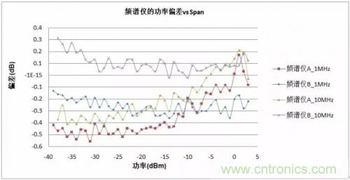 從上述測試結果我們發現Span的變化對頻譜分析儀A的幅度誤差影響較小,但測試功率變化時則產生了較大的誤差。而頻譜分析儀B針對不同的測試功率有著較好的精度,Span的變化卻導致了約0.4dB的誤差。