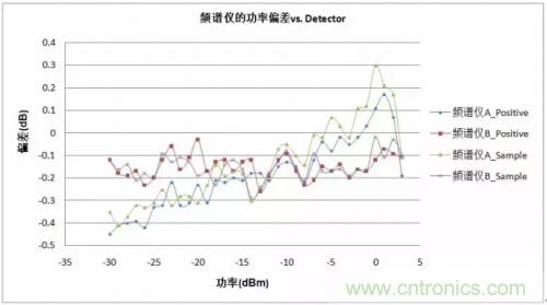 從測試結果我們發現,在Positive和Sample這二種Detector條件下,對於連續波信號的測試,二台頻譜分析儀的幅度誤差變化甚微,而對於調製信號,還需要類似的測試來進一步驗證。