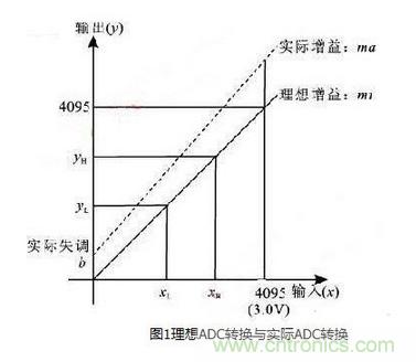 選用ADC的任意兩個通道作為參考輸入通道,並分別提供給它們已知的直流參考電壓作為輸入(兩個電壓不能相同),通過讀取相應的結果寄存器獲取轉換值,利用兩組輸入輸出值求得ADC模塊的校正增益和校正失調,然後利用這兩個值對其他通道的轉換數據進行補償,從而提高了ADC模塊轉換的準確度。圖1示出了如何利用方程獲取ADC的校正增益和校正失調。具體計算過程如下: