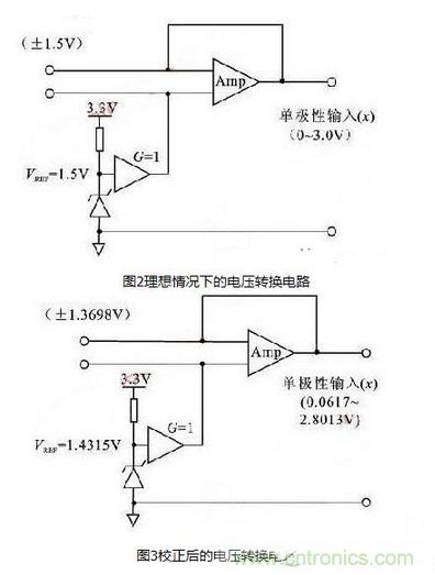 在實際應用中,所采集的信號經常為雙極型信號,因此信號在送至ADC之前需要添加轉換電路,將雙極型信號轉化為單極型信號。典型的轉換電路如圖2所示。對於ADC模塊,考慮到增益誤差和失調誤差對輸入範圍的影響,轉換電路需要調整為如圖3所示的電路。在圖3中,輸入增益誤差的參考範圍已經改變。