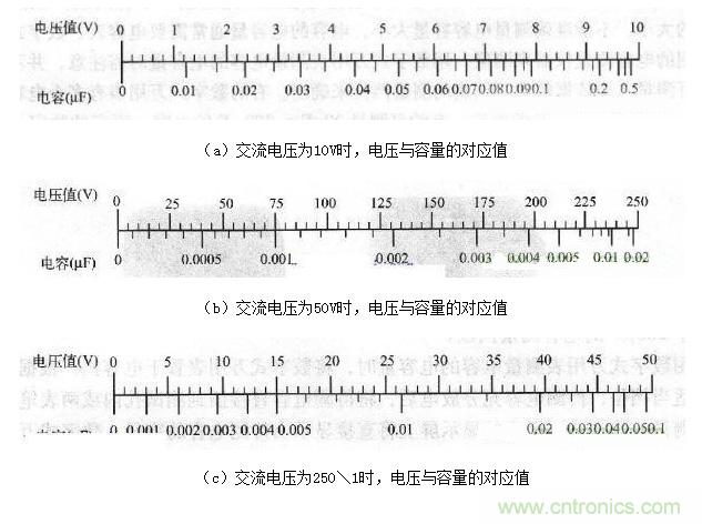 注意:(1)如果待測電容的電容量超出萬用表測量範圍,則不能用數字式萬用表測量。(2)數字式萬用表的表筆連接與指針式萬用表的表筆連接方法是相反的,指針式萬用表黑表筆接的是表內 電源正極,為表內電流流出端;數(shu)字(zi)式(shi)萬(wan)用(yong)表(biao)的(de)紅(hong)表(biao)筆(bi)接(jie)表(biao)內(nei)電(dian)源(yuan)正(zheng)極(ji),為(wei)表(biao)內(nei)電(dian)流(liu)流(liu)出(chu)端(duan)。電(dian)容(rong)充(chong)分(fen)放(fang)電(dian)後(hou)將(jiang)萬(wan)用(yong)表(biao)紅(hong)表(biao)筆(bi)接(jie)電(dian)解(jie)電(dian)容(rong)正(zheng)極(ji),黑(hei)表(biao)筆(bi)接(jie)電(dian)解(jie)電(dian)容(rong)負(fu)極(ji)可(ke)測(ce)出(chu)正(zheng)向(xiang)絕(jue)緣(yuan)電(dian)阻(zu)。反(fan)之(zhi),萬(wan)用(yong)表(biao)紅(hong)表(biao)筆(bi)接(jie)電(dian)解(jie)電(dian)容(rong)負(fu)極(ji),黑(hei)表(biao)筆(bi)接(jie)電(dian)解(jie)電(dian)容(rong)正(zheng)極(ji)可(ke)測(ce)出(chu)反(fan)向(xiang)絕(jue)緣(yuan)電(dian)阻(zu)。(3) 萬用表電壓法檢測電容用交流電壓法也可以檢測電容器,某些萬用表帶有此功能,如FM50型萬用表。下麵以FM50型萬用表為例,其檢測方法如下。萬用表的刻度盤上有交流電壓與電容容量相對應的刻度,如圖6所示。