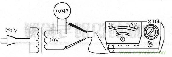(2)容量小於0.01 pF的固定電容的檢測 檢測10pF以下的小電容時,因電容容量太小,故用萬用表進行測量,隻能檢查其是否有漏電、內部短路或擊穿現象:測量時選用萬用表R×10k擋,將兩表筆分別任意接電容的兩個引腳,阻值應為無窮大。如果測出阻值為零,則可以判定該電容漏電損壞或內部擊穿。