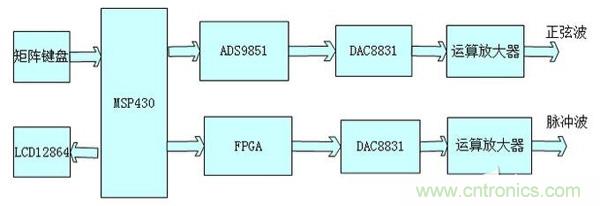 在實現此項項目過程中,很快實現了對於產生可控的正弦波並在液晶上顯示的基本要求與發揮部分,DDS芯片AD9851產生頻率可控的正弦波,在實踐測試中得之從AD9851輸出的正弦波幅值會隨頻率變化,最後通過軟件編程明顯減少了幅值誤差。關鍵部分就在於產生占空比可控的脈衝波,起初的思路是由AD9851產生的正弦波經過滯回比較器生成方波送到FPGAchanshengkekongdemaichongbo,danzuihouchanshengdemaichongbopinlvyuzhengxianbopinlvbuduiyingqieyingxiangzhengxianbodewendingdu,lianggemokuaizhijianyouyingxiang,zuihoutaolungaibianfangan,zaiMSP430送入控製信號的前提下在FPGA內部產生可控的脈衝波,結果很理想,基本達到了實驗要求和發揮的部分。