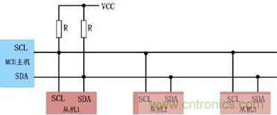 物理結構上,I2C總線隻有兩根雙向信號線,一根是數據線SDA,另一根是時鍾線SCL。