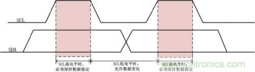 I2C總線進行數據傳送時,時鍾信號SCL為高電平期間,數據線SDA上的數據必須保持穩定,隻有在時鍾線SCL上的信號為低電平期間,數據線SDA上的高電平或低電平狀態才允許變化,如圖3所示。