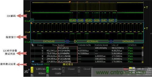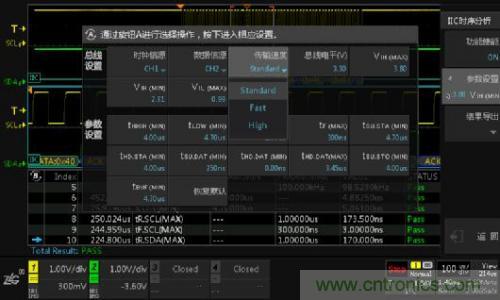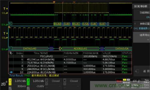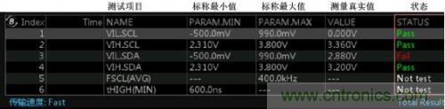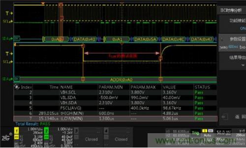 使用I2C時序分析軟件,它能夠在極短的時間內完成總線信號的DC特性和AC特性分析,並與器件手冊標稱參數做對比,直接輸出測試結果(Pass/Fail),同時支持報表導出,省去人工錄入數據的煩惱,極大的提升測試效率。具體測試界麵如下圖4所示。