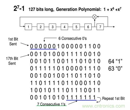 在圖一中可以看到,PRBS7最長是127bit(27-1), 理論上來說,7bit的2進製碼,一共會有27個不同組合,但是,如果碼流全部為‘0’的時候,經過異或運算,輸入到寄存器第一位的值還是0, 這樣移位寄存器將會一直輸出為零,移位寄存器被死鎖。所以PRBS碼流不能全部為零。另外,PRBS7 碼流中最長的連續‘1’個數為7個,最長的連續‘0’個數為6個。127bit的連續碼流中,一共有64個‘1’,63個‘0’。