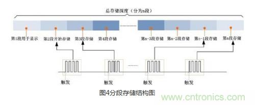 原理如下圖所示:總的存儲深度分為n段,第1段用於顯示,第2段開始存儲,也就是當發生第一次觸發時采集的數據存儲到第2段存儲空間中,當第2段存儲空間存儲滿之後,結束第一次觸發,等待第二次觸發的到來,觸發後把數據存儲到第3段存儲空間中,以此類推。