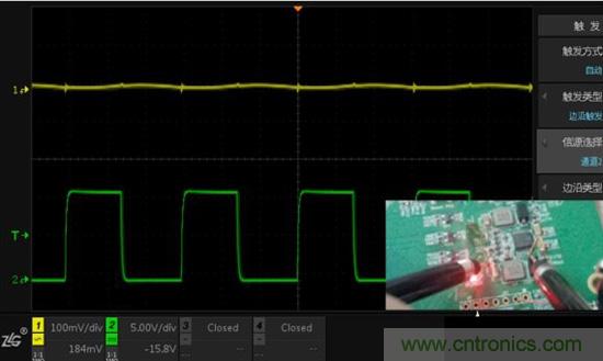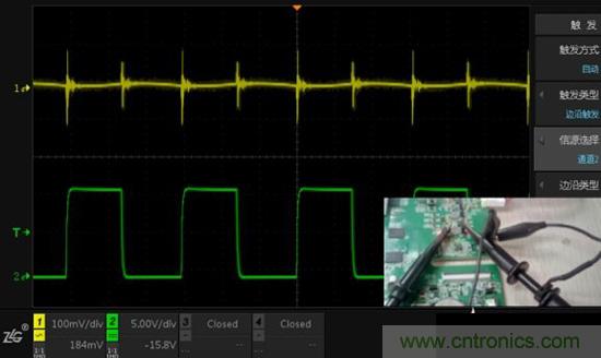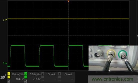 測試方法:通道1測量小信號(100mv/div),通道2測量大信號(5V/div),觀察信號互相影響的情況。