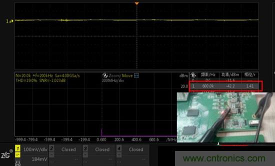 注:通道1信號幅度雖然非常小,但通過FFT分析還是可以定位出600K頻點的幹擾。