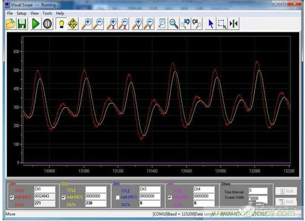 LDO本身的電壓輸出非常穩定,由於筆者ADC采樣為10位,在手指未放入傳感器時,電壓值幾乎保持在3/1024以內跳動。所以筆者默認這款LDO能達0.3%以下的精度。下圖便是筆者關於LDO給gei模mo擬ni部bu分fen供gong電dian後hou的de心xin率lv采cai樣yang波bo形xing。紅hong色se為wei一yi階jie低di通tong濾lv波bo前qian的de波bo形xing,黃huang色se為wei低di通tong濾lv波bo後hou的de波bo形xing。對dui實shi時shi性xing要yao求qiu不bu高gao的de係xi統tong來lai說shuo,這zhe樣yang的de模mo擬ni量liang波bo形xing已yi經jing能neng夠gou滿man足zu項xiang目mu的de需xu求qiu。