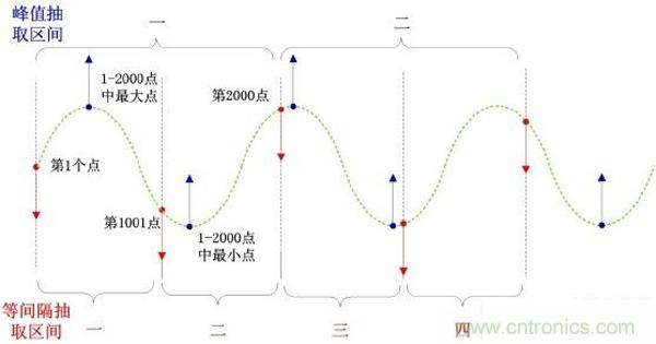 峰值抽取是采樣點有 2M,顯示點數 2k,實際顯示是 2k 個點抽取兩個,0~2000 點之間找最大和最小值,然後是 2001~4000 之間找最大和最小值,以此類推,重新構建波形。如下圖:
