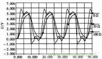 圖中分別標出了匹配電阻是0Ω、33Ω、100Ω時接收端的信號波形。從波形看出,0Ω時波形有很大的上衝和下衝現象,信號最差;100Ω時信號衰減較大,方波幾乎變成了正弦波;而匹配電阻是33Ω時波形較好。理想的匹配電阻值,可以利用軟件的terminatorWizard工具,自動根據器件的參數模型算出最佳匹配電阻為33.6Ω,實際應用中可以選用33Ω。利用仿真和器件的IBIS模型,可以很精確地知道匹配電阻值的大小,從而使信號完整性具有可控性。