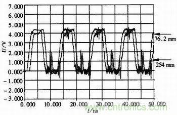 在高速數字電路的設計中,除了阻抗匹配外,部分器件對傳輸線的長度有著嚴格的要求,信號頻率越高,要求傳輸線的長度越短。以X1器件和X2器件為例建立仿真模型如圖3所示。在仿真模型中加了33Ω的匹配電阻,選擇仿真信號頻率為66MHz方波,改變傳輸線長度分別為76.2mm和254mm時進行仿真。仿真結果如圖4所示。