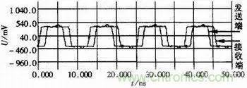 在實際的PCB布bu線xian時shi,如ru果guo由you於yu產chan品pin結jie構gou的de需xu要yao,不bu能neng縮suo短duan信xin號hao線xian長chang度du時shi,應ying采cai用yong差cha分fen信xin號hao傳chuan輸shu。差cha分fen信xin號hao有you很hen強qiang的de抗kang共gong模mo幹gan擾rao能neng力li,能neng大da大da延yan長chang傳chuan輸shu距ju離li。差cha分fen信xin號hao有you很hen多duo種zhong,如ruECL、PECL、LVDS等,表1列出LVDS相對於ECL、PECL係統的主要特點。LVDS的恒流源模式低擺幅輸出使得LVDS能高速驅動,對於點到的連接,傳輸速率可達800Mbps,同時LVDS低噪聲、低功耗,連接方便,實際中使用較多。LVDS的驅動器由一個通常為3.5mA的恒流源驅動對差分信號線組成。接收端有一個高的直流輸入阻抗,幾科全部的驅動電流流經10Ω的終端電阻,在接收器輸入端產生約350mV電壓。當驅動狀態反轉時,流經電阻的電流方向改變,此時在接收端產生有效的邏輯狀態。圖5是利用LVDS芯片DS90LV031、DS90LV032把信號轉換成差分信號,進行長距離傳輸的波形圖。在仿真時設置仿真頻率為66MHz理想方波,傳輸距離為508mm,差分對終端接100Ω負載匹配傳輸線的差分阻抗。從仿真結果看,LVDS接收端的波形除了有延遲外,波形保持完好。
