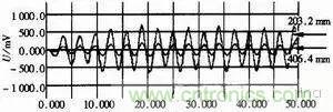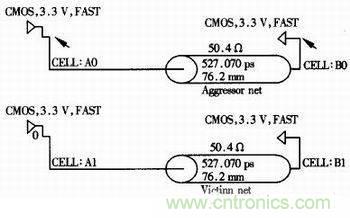 由於頻率的提高,傳輸線之間的串擾明顯增大,對信號完整性也有很大的影響,可以通過仿真來預測、模擬,並采取措施加以改善。以CMOS信號為例建立仿真模型,如圖6所示。在仿真時設置幹擾信號的頻率為66MHz的方波,被幹擾者設置為零電平輸入,通過調整兩根線的間距和兩線之間平行走線的長度來觀察被幹擾者接收端的波形。仿真結果如圖7,分別為間距是203.2mm、406。4mm時的波形。