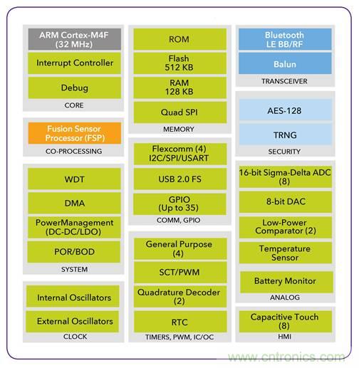 圖3,NXP最新推出的支持BLE的無線MCU QN908x,內置優化的FSP硬件協處理器