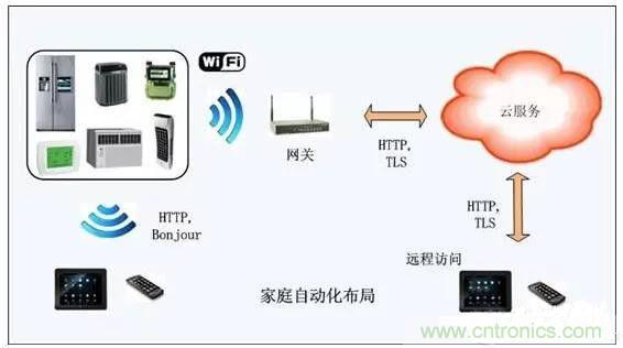 從上圖可看出,家庭自動化係統將嵌入式微控製器技術、無線連接、接入網絡融合為一體。Apps軟件能夠使用戶發現家裏的設備,予以設置,或者創建一個動作加以控製。