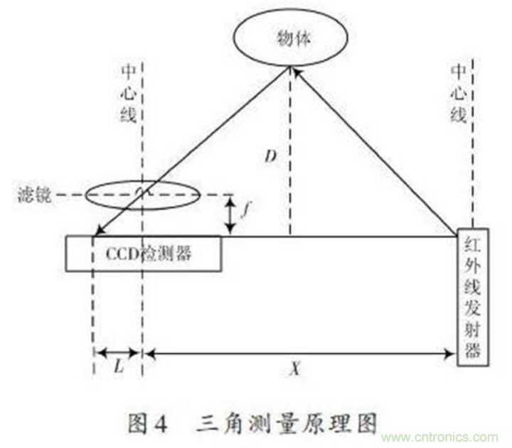 紅外感應器包含紅外發射器與CCD檢測器,紅外線發射器會發射紅外線,紅外線在物體上會發生反射,反射的光線被CCD檢測器接收之後,由於物體的距離D不同,反射角度也會不同,不同的反射角度會產生不同的偏移值L,知道了這些數據再經過計算,就能得出物體的距離了,如下圖所示。