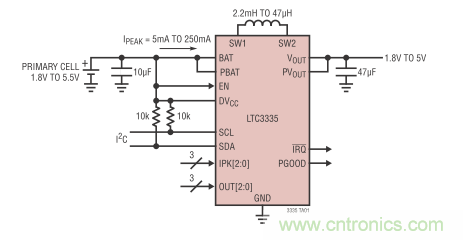 LTC3335 是一款毫微功率高效率同步降壓-升壓型轉換器,內置了精確的庫倫計數器,提供高達 50mA 連續輸出電流。該器件具僅為 680nA 的靜態電流,可編程峰值輸入電流從低至 5mA 直至 250mA,非常適合多種低功率電池應用,例如在可穿戴設備和 IoT 設備中見到的那些應用。其 1.8V 至 5.5V 輸入電壓範圍和 8 個 1.8V 至 5V 的用戶可選輸出允許在輸入電壓高於、低於或等於輸出電壓時,提供穩定的輸出電源。此外,該器件集成的精確 (±5% 電池放電測量準確度) 庫(ku)倫(lun)計(ji)數(shu)器(qi)可(ke)在(zai)長(chang)壽(shou)命(ming)不(bu)可(ke)再(zai)充(chong)電(dian)的(de)電(dian)池(chi)供(gong)電(dian)應(ying)用(yong)中(zhong),對(dui)累(lei)積(ji)電(dian)池(chi)放(fang)電(dian)提(ti)供(gong)準(zhun)確(que)監(jian)視(shi),這(zhe)類(lei)應(ying)用(yong)在(zai)很(hen)多(duo)情(qing)況(kuang)下(xia)具(ju)極(ji)其(qi)平(ping)坦(tan)的(de)電(dian)池(chi)放(fang)電(dian)曲(qu)線(xian)。典(dian)型(xing)應(ying)用(yong)包(bao)括(kuo)無(wu)線(xian)傳(chuan)感(gan)器(qi)、遠程監視器和ADI的 Dust Networks SmartMesh係統。LTC3335 包含 4 個內部低 RDSON MOSFET,可提供高達 90% 的效率。其他特點包括一個可編程放電報警門限、一個用於存取庫倫計數值和器件設定的 I2C 接口、一個電源良好輸出和 8 個 5mA 至 250mA 的可選峰值輸入電流以適合多種類型和尺寸的電池。采用耐熱增強型 20 引線 3mm x 4mm QFN 封裝的 LTC3335 的工作結溫範圍為 -40°C 至 +125°C。圖 2 顯示了 LTC3335 的典型應用電路。