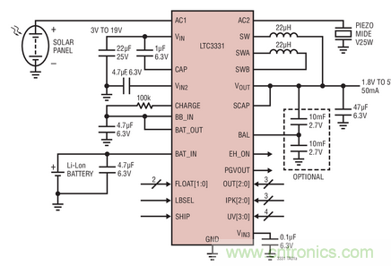 LTC3331 是一款完整的能量收集解決方案,提供高達 50mA 連續輸出電流,當可收集能量可用時能延長電池壽命。簡便的 10mA fenliuqiyongshoujidenenglianggeikechongdiandianchichongdian,tongshididianchidianliangduanjiegongnengbaohudianchimianyushendufangdian。dangyongshoujidenengliangxiangfuzaitigongwendinggonglvshi,gaiqijianjinxuyaodianchitigong 200nA 電源電流,當在無負載情況下由電池供電時,僅需要 950nA 工作電流。LTC3331 集成了一個高壓能量收集電源、一個電池充電器和一個同步降壓-升壓型 DC/DC 轉換器,可為能量收集應用提供一個持續穩定的輸出,例如無線傳感器網絡中的能量收集應用。能量收集電源由適合 AC 或 DC 輸入的全波橋式整流器和高效率降壓型轉換器組成,從壓電 (AC)、太陽能 (DC)、或磁性 (AC) 能源收集能量。當沒有收集能量可用時,可充電電池輸入給降壓-升壓型轉換器供電,該轉換器在直至 4.2V 的整個電池電壓範圍內運行,無論輸入高於、低於或等於輸出,都可調節輸出。當收集能源不再可用時,LTC3331 自動轉換至電池。LTC3331 的能量收集輸入在 3V 至 19V AC 或 DC 電壓範圍內運行,從而使該器件非常適合多種壓電、太陽能或磁性能源。其輸入欠壓閉鎖門限設定是可編程的,範圍為 3V 至 18V,從而使應用能夠在峰值功率傳送點上運行能量收集電源。其他特點包括引腳可編程輸出電壓和降壓-升壓峰值電流限製、一個超級電容器平衡器和一個輸入保護性分路器。LTC3331 采用耐熱增強型 5mm x 5mm QFN 封裝。圖 3 顯示了 LTC3331 的典型應用電路。