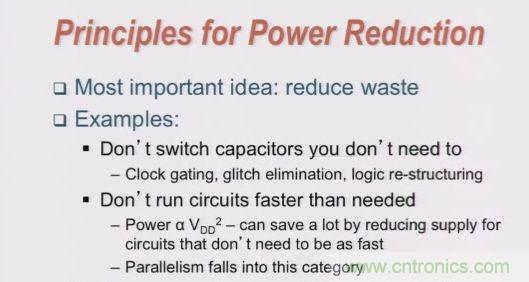 •降低頻率:利用並行處理增加電路來降頻,犧牲麵積來降低功耗。