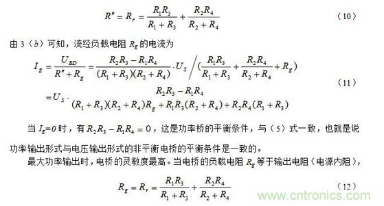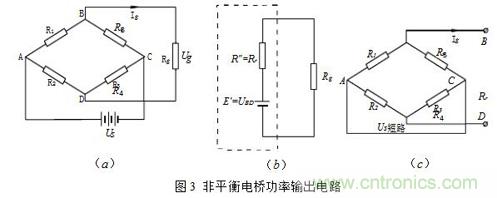 (3)Rg相對橋臂電阻可比擬時的非平衡電橋(功率輸出形式)當負載電阻Rg與橋臂電阻可比擬時,則電橋不僅有輸出電壓Ug,也有輸出電流Ig,也就是說有輸出功率,此種電橋也稱為功率橋。功率橋可以表示為圖3(a)。