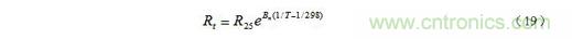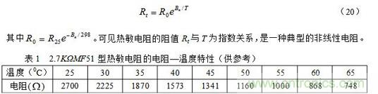 其中R25和Rt分別為25℃和t℃時熱敏電阻的阻值,T = 273 + t;Bn為材料常數,其值因製作時不同的處理方法而異,對確定的熱敏電阻,可以由實驗測得的電阻—溫度曲線求得。我們也可以把(19)式寫成比較簡單的表達式