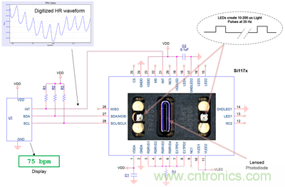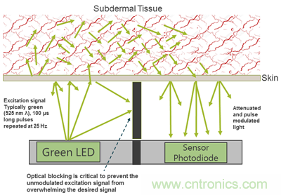 圖3以Silicon Labs的Si118x光guang學xue傳chuan感gan器qi為wei例li來lai說shuo明ming電dian路lu原yuan理li,基ji於yu此ci器qi件jian可ke以yi相xiang對dui方fang便bian地di實shi現xian心xin率lv檢jian測ce設she計ji。工gong程cheng師shi隻zhi需xu專zhuan注zhu於yu設she計ji的de光guang學xue部bu分fen,其qi中zhong包bao括kuo電dian路lu板ban上shang各ge部bu分fen間jian的de光guang學xue單dan元yuan和he將jiang該gai係xi統tong如ru何he與yu皮pi膚fu配pei合he。