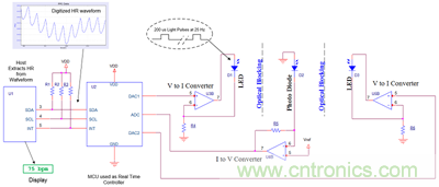 如圖2所示,在一個光電心率係統設計中,難以實現和成本很高的功能模塊分別是:快速的、大電流的驅動LED的電壓到電流轉換器,用於光電管的電流到電壓轉換器,以及運行算法和對序列信號進行處理的MCU。一個可被設置到低至2mA的很低電流,但同時仍然能產生短至10µs的非常窄的光脈衝低噪聲(75 - 100 dB SNR)300mA LED驅動器也是一個用分離器件實現起來非常昂貴的模塊。