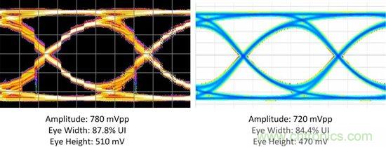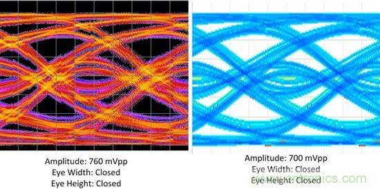 DS125BR820在筆者的係統輸出端打開了眼圖。圖2所示的實例1表明有足夠的餘量,看來DS125BR820能補償更多的通道損耗同時使眼圖仍能保持開啟狀態。圖3所示的實例2展示了相反的情況:筆者的通道有太多的損耗,在這些運行條件下筆者很可能會看到誤碼,除非在通道的末端使用接收芯片的均衡功能。