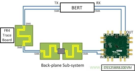 zheyiqietingqilaihenbang,dangaigongjunenggeinindailaikekaodejieguoma?weilehuidazhegewenti,bizhequleshiyanshi,bingjinxingleyixieceliang。bizhejuedingshiyongyigesulvwei12.5Gbps的Linear re-driver DS125BR820EVM、一些FR4印刷電路板(PCB)走線以及具有SMA連接器、適用於背板子係統的子卡。圖1展示了筆者的簡單設置。使用一個誤碼率測試器(BERT)作為為本次研究的發送器及接收器)。