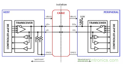 一種可能的隔離方法如圖2a所示。圖中,虛線表示隔離在理論上將USB電纜分割。D+和D–的狀態信息可以跨越隔離柵,但電流不能。GND1節點(上遊的接地基準)現在與GND2節點(下遊的接地基準)相互分離。不幸的是,隔離使主機無法“看到”下遊的上拉電阻,而外設無法“看到”上遊的下拉電阻。因此,需要使用一些額外的電阻,如圖2b所示,以便跨越隔離模仿相應連接。在這個“透明”概念中,主機與外設之間的通信方式和圖1中的非隔離式連接十分類似。透明的USB隔離器元件可方便地插入收發器和USB電纜之間,並使用隔離電源。原本設計用於非隔離式應用的主機和外設可方便地連接USB隔離器並交換標準USB信號,無需大幅改動設計。