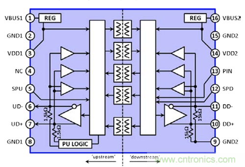 ADI的ADuM4160 USB數字隔離器2滿足全部要求,采用16引腳SOIC封裝。原理框圖如圖3所示。它包含一對USB收發器、5個基於iCoupler®的數字隔離通道、控製邏輯以及2個“智能調節器”。它還集成1.5 kΩ上遊上拉電阻,以及15 kΩ下遊下拉電阻。