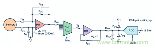 圖 1 是一種可以達到 0.1% 精度要求的簡單數據采集係統,也就是說,每輸入 1V 的電壓,輸出要麼為 0.99388V,要麼為 1.00612V。因此,轉換器規定的動態範圍為 60dB 或 9.67ENOB,假設其滿量程電壓為 10 V。轉換器有兩個放大器級、一個多路複用器和一個 ADC。本分析將忽略傳感器、電纜、連接器、PCB 寄生電容和任何外部影響/誤差,因為這些情況在很大程度上取決於我們要測量的具體應用或信號。