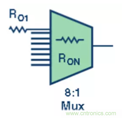 第二級,將放大器的輸出信號施加到多路複用器的 8 個輸入端 (圖3)。每個輸入以一個阻尼電阻 (RO) 進(jin)行(xing)緩(huan)衝(chong),以(yi)減(jian)少(shao)多(duo)路(lu)複(fu)用(yong)器(qi)通(tong)道(dao)切(qie)換(huan)導(dao)致(zhi)的(de)電(dian)荷(he)反(fan)衝(chong)。根(gen)據(ju)多(duo)路(lu)複(fu)用(yong)器(qi)數(shu)據(ju)手(shou)冊(ce)規(gui)定(ding)的(de)技(ji)術(shu)規(gui)格(ge),每(mei)個(ge)通(tong)道(dao)的(de)內(nei)部(bu)會(hui)設(she)有(you)一(yi)些(xie)寄(ji)生(sheng)電(dian)容(rong)或(huo)額(e)定(ding) RO。