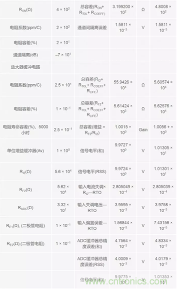 前麵定義了全部有源和無源誤差,接下來,我們要把這些誤差輸入電子表格裏,以便計算信號鏈的直流精度。表4展示了完成這一任務的一種方法。