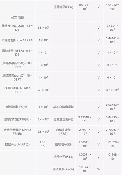 在計算結果,所有誤差均已轉換成電壓格式。這樣是為了方便起見,因為轉換器處於信號鏈末端,其輸入滿量程是以電壓進行描述的。RTO (參考輸出)用於描述從一級到下一級連續累計的 誤差。各級同時還產生一個獨立的合計數和RSS (和方根)合計數,以展示根據所用方法的不同,誤差是如何累積起來的。