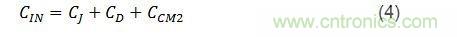 從圖中可以清楚地看出,CJ、 CD和CCM2是並聯,因此反相輸入端電容為: