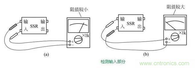 檢測固態繼電器時,將萬用表置於“Rx1K”檔,分別檢測其輸入部分和輸出部分。